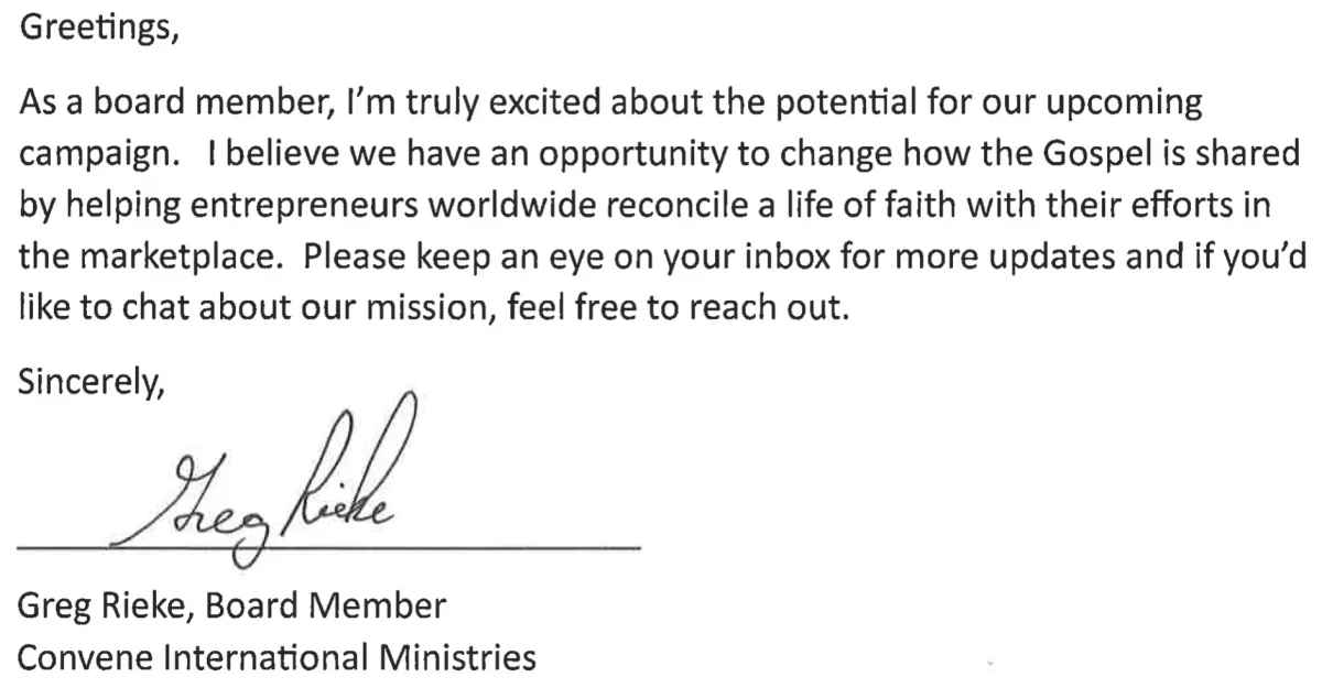 As a board member, it has been exceptionally gratifying to work with Brian as he expands Convene internationally. A project of this magnitude requires management, oversight, and funding. Brian can certainly provide management and oversight as is evidenced by the incredible success of ConveneNow. However, the funding will emanate from individuals like you and me. Please keep an eye on your inbox for more updates and if you'd like to discuss Brian’s progress or need an update, feel free to contact me by email ([email protected]) or phone at (949) 370-3361. Thank you for your consideration!